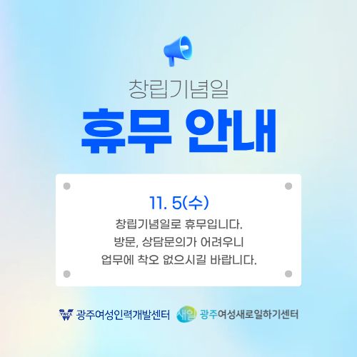 수강신청 안내 자료실 구인정보 오시는길 공지사항 [공지사항] 광주여성인력개발센터 11~1... 10-31 2025년 동구여성대학 카페브런치 조리전... 10-23 [업무협조] 입양전 일시가정위탁부모 모집... 09-18 기업교육 및 워크숍 참여기업 모집... 09-17 [공지사항] 광주여성인력개발센터 도배시공... 03-18 최신프로그램 [권익보호특강] 알기쉬운 노동법... 10-31[12월] 한식 디저트 만들기 수강생 모집...10-30[12월] 타로카드로 알아보는 심리이야기 (원데...10-30[12월] 브런치 파티 쿠킹 클래스 수강생 모집...10-29[12월] 타로카드 수강생 모집...10-27 상담가능시간 09:00 ~ 18:00 상담 및 문의 전화 062-511-0001~3 입금계좌번호 안내 광주은행 001-107-617594광주여성인력개발센터 카카오톡 인스타그램 블로그